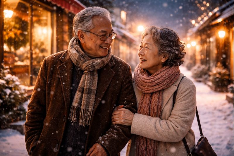 人生の折り返し地点で咲く恋は、雪の光や街灯のやわらかい光のように、そっと胸に染み込みます。