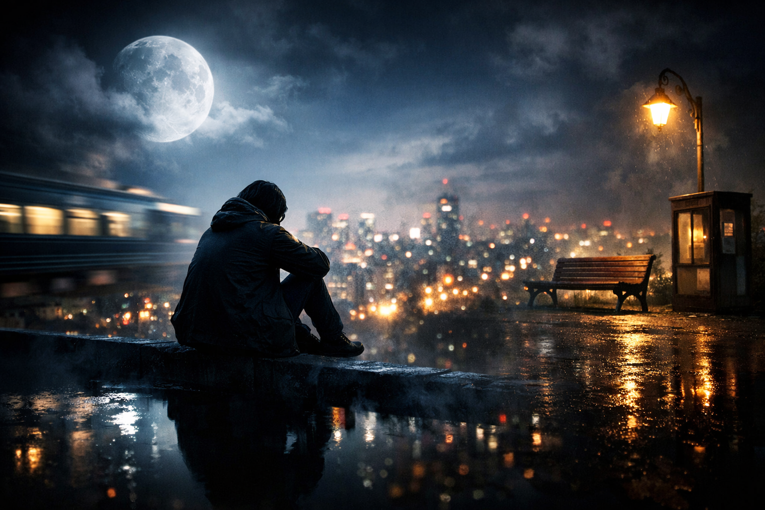 窓の外には無数のネオンと人々がいるのに、彼の世界はどこか閉ざされています。